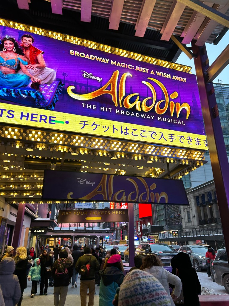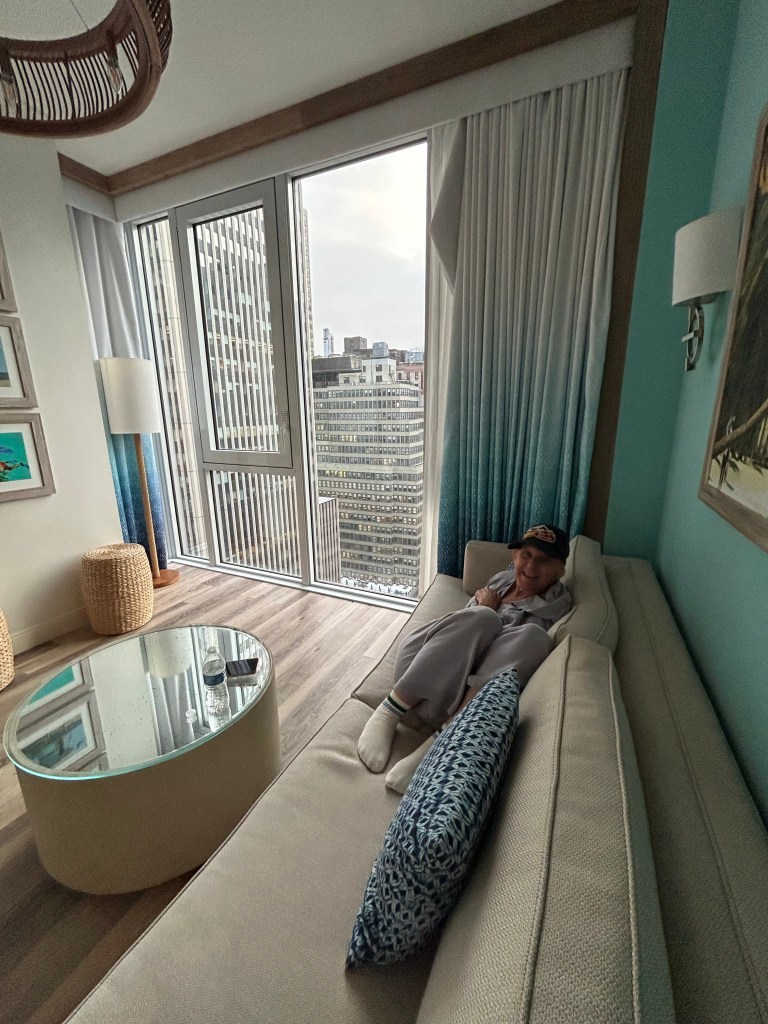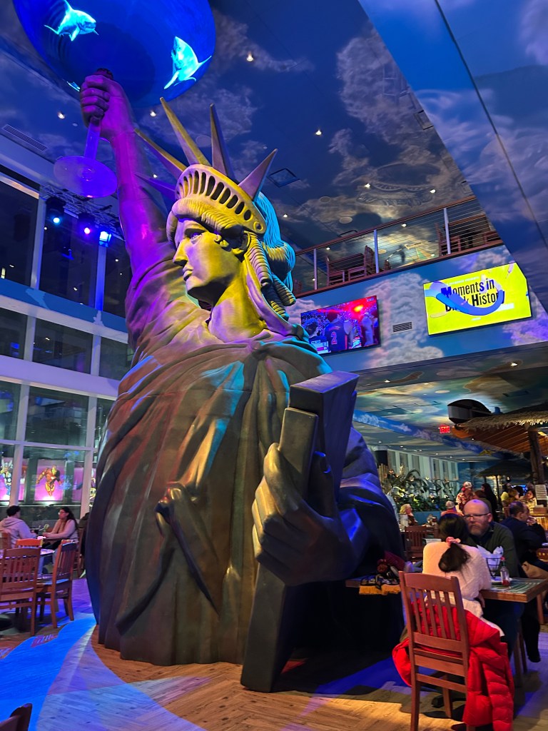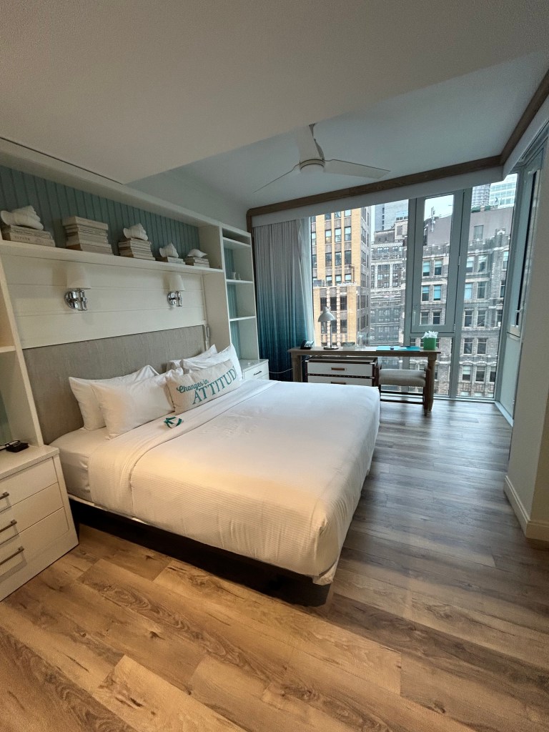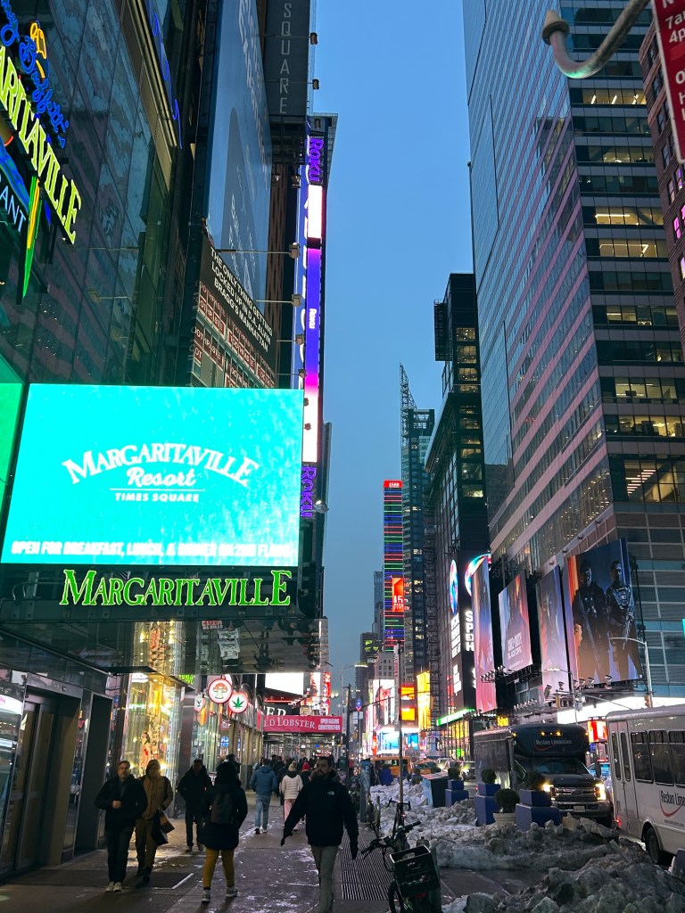 This anniversary weekend, the winter weather did not treat us much better. We had hoped to escape to a warm climate for a few days in the sun, only to be faced with a forecasted cold snap in the south that rendered Florida with lows in the 20s. Not exactly sun-bathing weather. The memory of our chilly Thanksgiving day at Disney was still too fresh, so we opted for a clever compromise—Jimmy Buffet’s Margaritaville Hotel in Times Square complete with a Disney show on Broadway! The perfect blend of beach vibe and Disney magic, mostly indoors and only a 6 hour drive away.