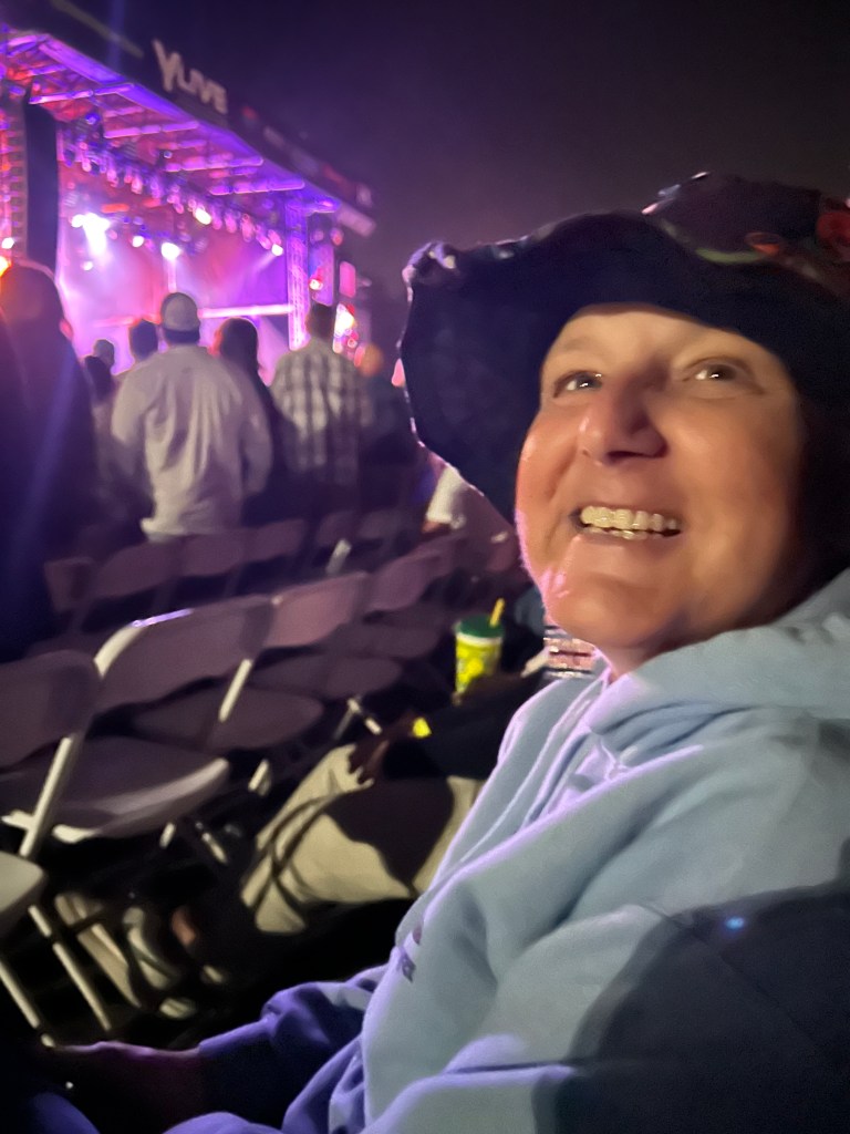 So, with Erica in her wheelchair and the help from our son Christian and his girlfriend Lauren, we navigated the crowd to the front section seats where we sat just under the jumbo video. Her hero larger than life just feet away. Unfortunately, I had not taken in account the better side for her good ear. But the music was more than loud enough and brought smiles, and an occasional whoo-hoo, from her all concert long.