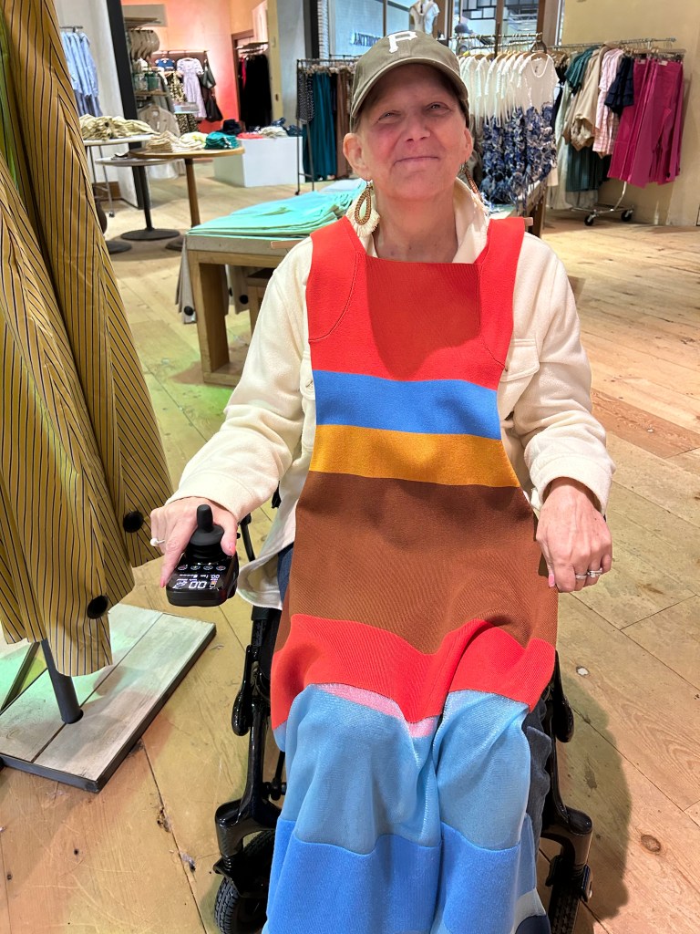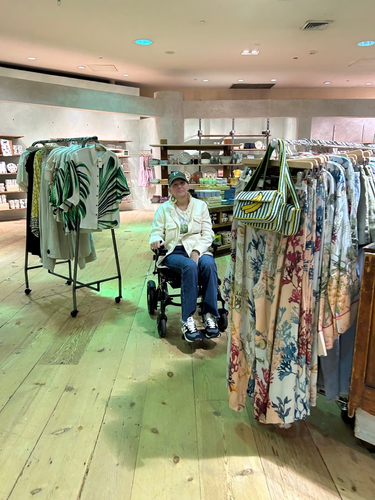So we combat the boredom and celebrate Erica’s birthday week with her favorite therapy—retail. Three separate shopping trips to update her beach wardrobe and get birthday gift ideas. In her new electric wheelchair (which she refuses to call a wheelchair), Erica’s shopping experiences are more independent and bring the joy of freedom. She navigates to her desires while I manage the dressing room. I am told that I do very well, which is a high compliment from someone who has managed fashion shoppers professionally.